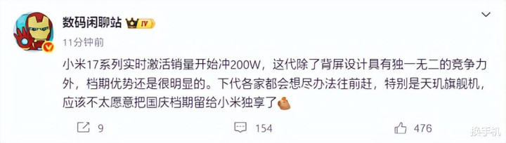 知名爆料博主数码闲聊站表示,小米17系列的激活销量开始冲击200万台,是今年新一代安卓旗舰中的最强成绩。 更加可喜的是,小米17系列当中,同样是价格最高的Pro Max卖的最好,上代小米15系列则是标准版最受欢迎。 随着其他安卓旗舰-vivo X300、OPPO Find X9、荣耀Magic8系列等陆续上市,很显然对小米17系列的增速造成了很大影响。 之前媒体和小米官方确认,小米17系列仅上市5天,销量就超过100万台。不过马上到200万台的小米17系列,市场表现也足够出色了。